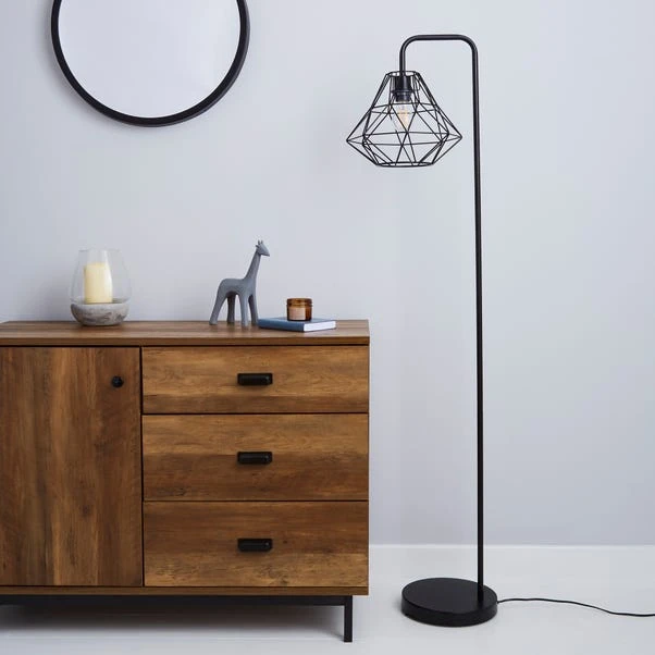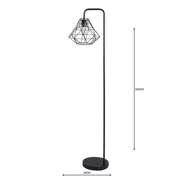 Add a contemporary element to your home décor with this stunning floor lamp, featuring a geometric frame head with an inline floor switch, cable length 100cm, and completed with a smooth black finish.
