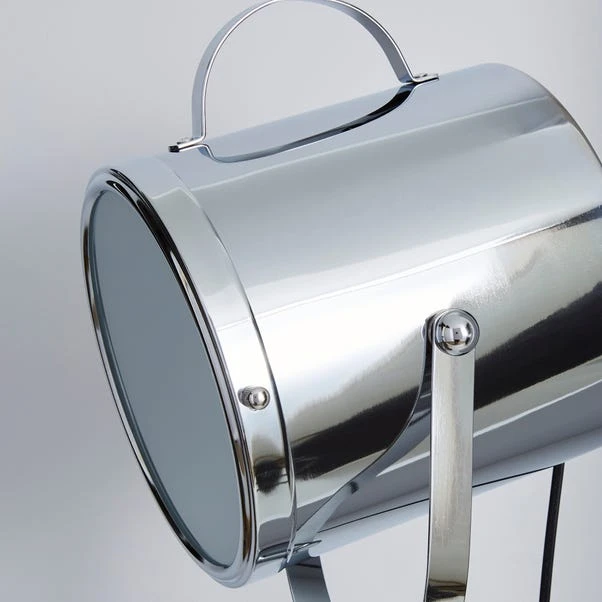 This chrome camera style floor lamp will add a modern feel to your room. With an adjustable shade angle you can light up any corner. This floor lamp has a foot switch with a 150cm cable.