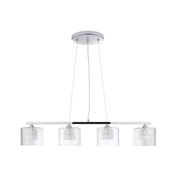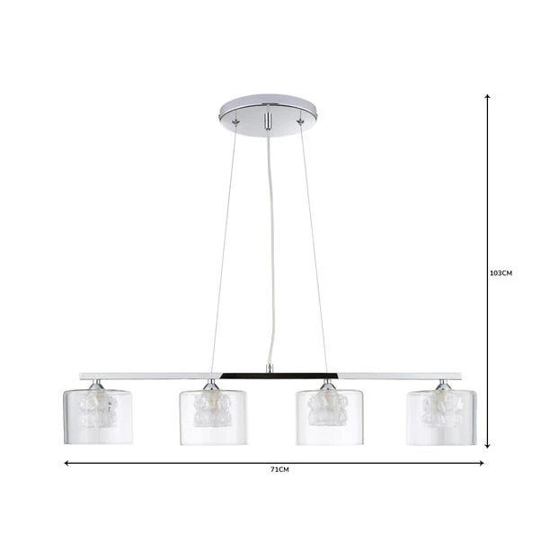 Add a modern and contemporary touch to your home with this elegantly designed fitting. It features four dual layer glass shades, attached to a chrome metal bar and suspended from three height adjustable fabric ropes with a clear flex in the centre. This piece is finished with a beautiful chrome metal base. With its stylish and elegant design, the Erie 4 light would make a stunning addition above a dining table or kitchen island.