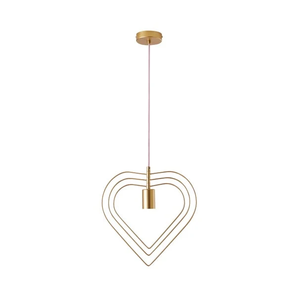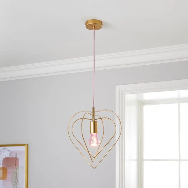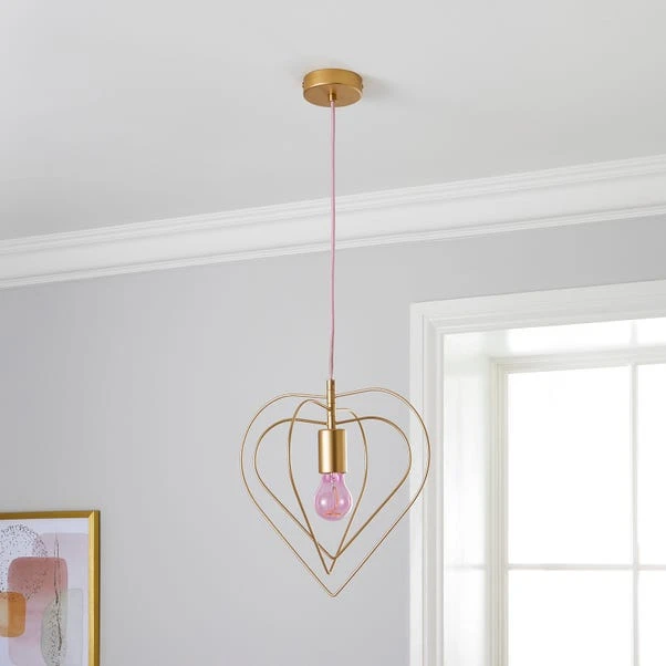 Add a fun and feminine touch to your little ones room with this stunning Heart 1 Light Pendant Ceiling fitting. Beautifully finished with a satin gold effect base and a 3D adjustable heart shape design. This pendant ceiling fitting is complete with a height adjustable pink cable and is dimmable compatible with a suitable bulb and switch.