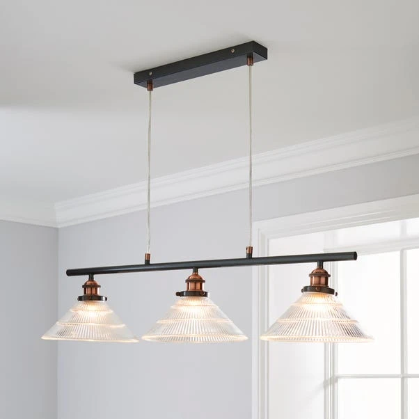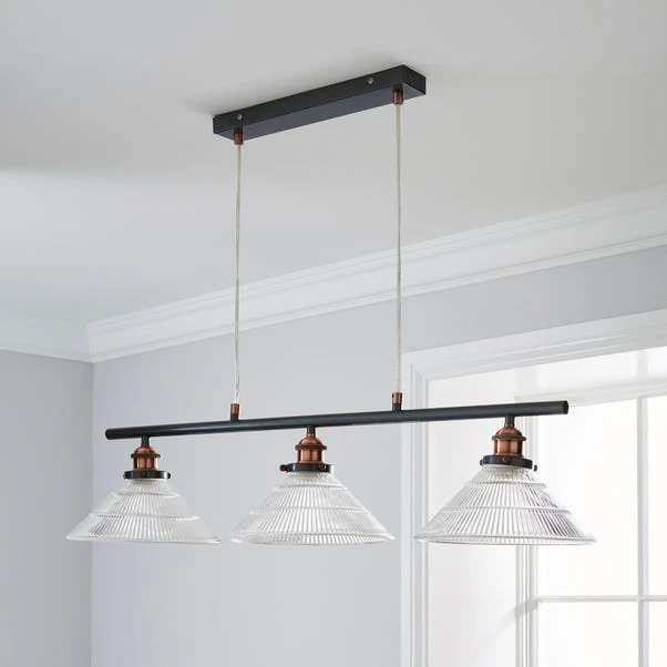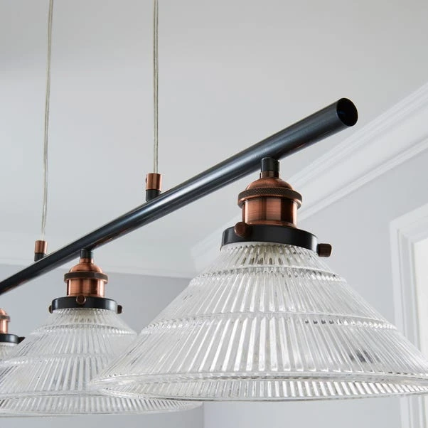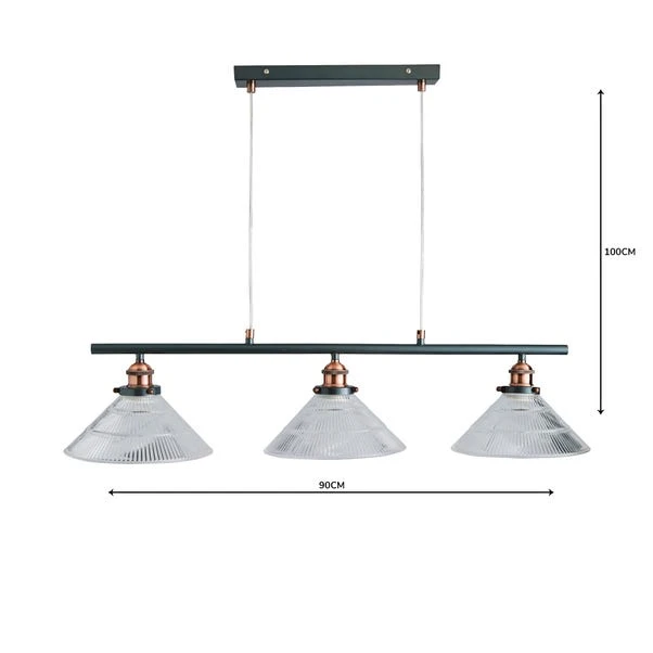 Add a contemporary element to your home décor with this stunning Logan Glass 3 Light Diner Fitting which can also be adjusted in height. Featuring a chic textured glass shade. This light fitting has been crafted with intricate detailing on the cup for a beautiful industrial modern look that will sit seamlessly with any home style.