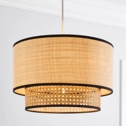 Introducing the beautiful Malika Cane 2 Tier Easy Fit Pendant, featuring a natural coloured shade weaved in raffia and cane material with a black trim for a detailed finish. The perfect easy fit pendant for any modern and traditional home.