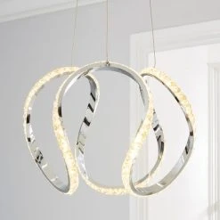 With its unique curved design, the striking Marsia light fitting is ideal for adding a touch of contemporary class to your décor. Complete with integrated LED strips and adjustable in height, this stunning light fitting features glass jewel encrusted metal arms, a gorgeous chrome finish. Please note this piece is not dimmable compatible.