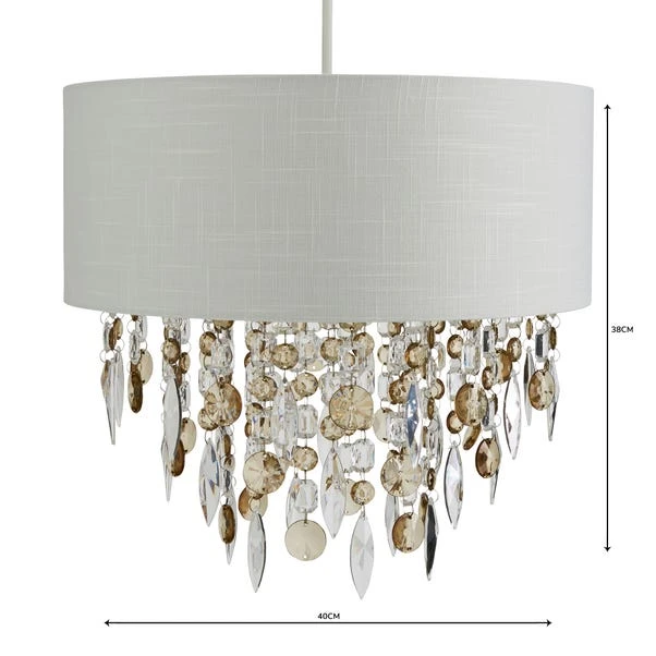 Crafted with an ivory linen-effect fabric shade, this elegant light pendant boasts smoky acrylic crystal droplets hanging from the centre.