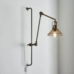 Offering a modern industrial style, the Nicholas wall light is finished in a distressed pewter finish metal base with an adjustable metal arm and mesh head for an industrial look. Perfect for your bedside or workspace, this piece has matching family items available to help coordinate your home.