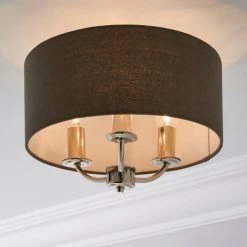 Offering a timeless, classic style, the Preston 3 light flush ceiling fitting features a stunning bright nickel finish, paired with an elegant charcoal coloured linen effect shade. This fitting is also fully compatible with dimmer switches.