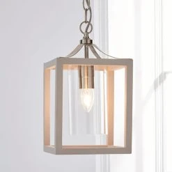 With it’s delicate light grey wooden frame and satin nickel features, the Tove Wooden 1 Light Pendant is perfect for bringing a light and elegant touch to your home décor. This stunning pendant fitting comes complete with a clear glass cylinder shade, grey fabric flex cable and adjustable chain suspension.