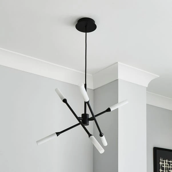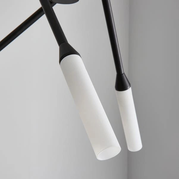 The Elements Fontain 6 Light Ceiling Fitting features an impressive modern contemporary design with a steel matt black paint effect base paired with double sided matt white glass tube shades. This unique piece is height adjustable, dimmable and impressive in size, perfect for complementing a range of contemporary home décors. Matching family items are available to help coordinate your space.
