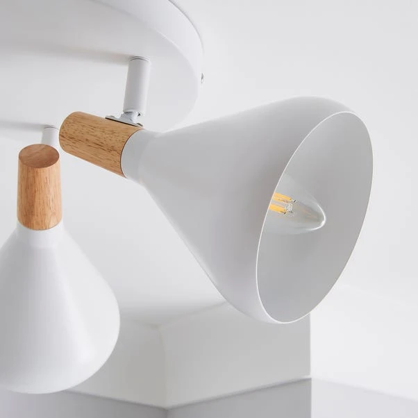 Offering a fresh contemporary design, the Wolston 3 light spotlight is perfect for giving your home a light, scandi feel. Perfect for any space, this stylish fitting features three adjustable white conical shades, complete with light wood toppers for a natural touch.